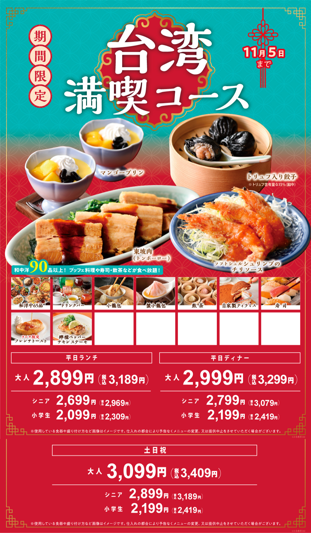【台湾グルメを食べつくす!!至福の特別メニュー登場!!】11/5迄!和洋中の食べ放題『ニラックスブッフェ』にて「トリュフ入り餃子・マンゴープリン」などの台湾グルメが楽しめる特別コースが期間限定にて新登場!