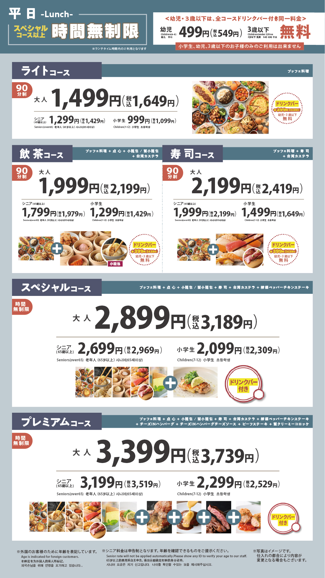 ※ライトコース、飲茶コース、寿司コースは別料金となります
