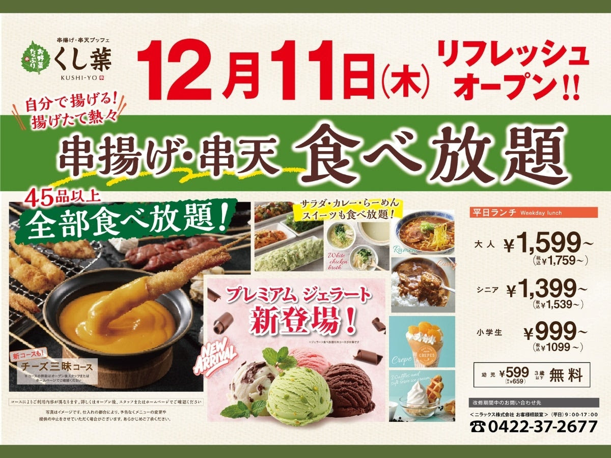 【12/11リフレッシュOPEN!!】『チーズ』づくしの新コースや食後のスイーツ『ジェラート』が新登場!串揚げ・串天ブッフェ くし葉 横浜ワールドポーターズがさらに充実の食べ放題に生まれ変わります!