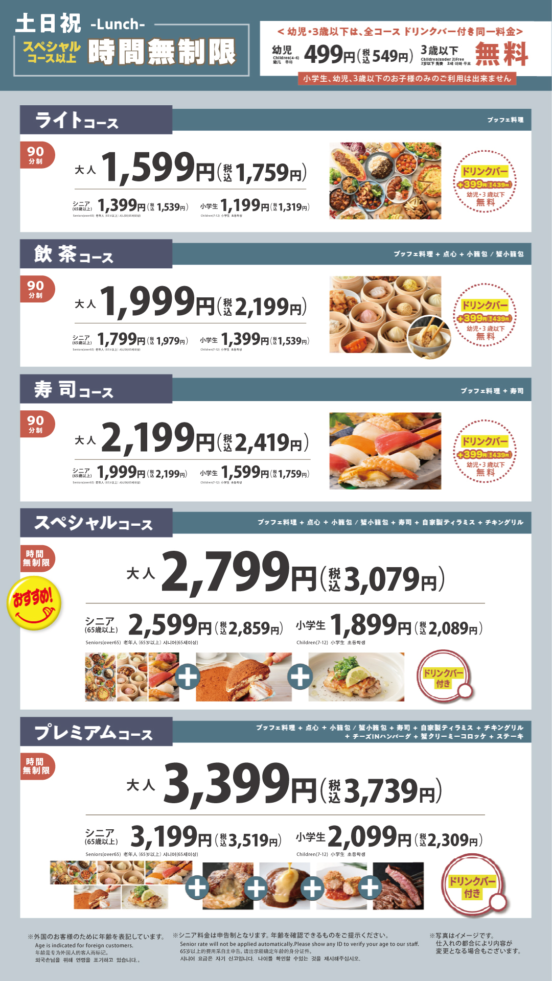 ※ライトコース、飲茶コース、寿司コースは別料金となります