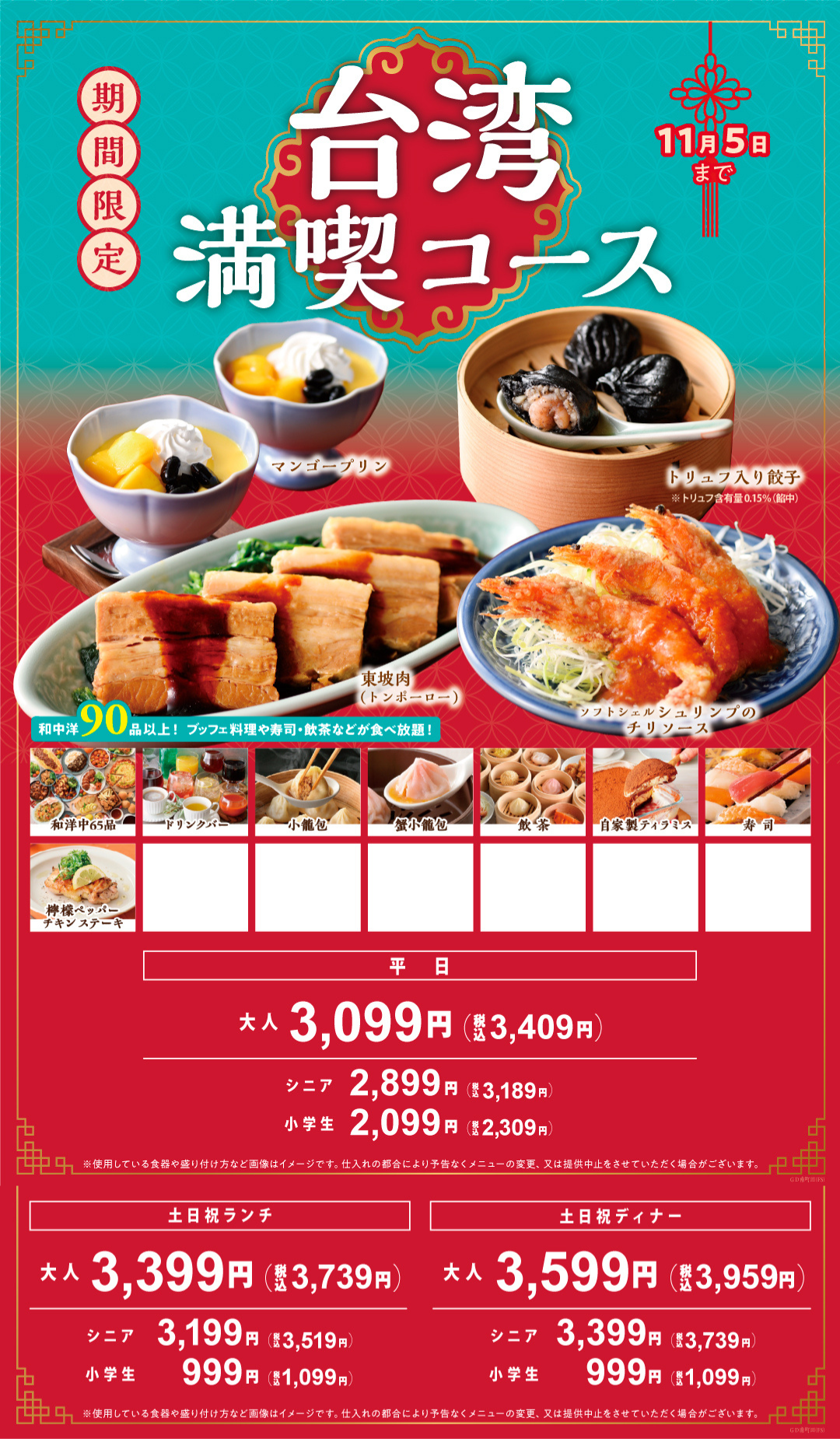 【台湾グルメを食べつくす!!至福の特別メニュー登場!!】11/5迄!和洋中の食べ放題『ニラックスブッフェ』にて「トリュフ入り餃子・マンゴープリン」などの台湾グルメが楽しめる特別コースが期間限定にて新登場!