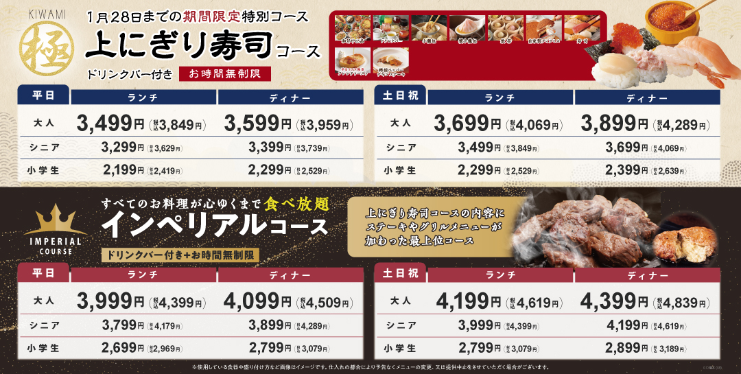 【年末年始は贅沢三昧!!上にぎり寿司食べ放題!!】大人気企画再び!バラエティー豊かな食べ放題「ニラックスブッフェ」にて『生帆立』やディナー限定での『いくら』などが堪能できる特別コースが新登場!