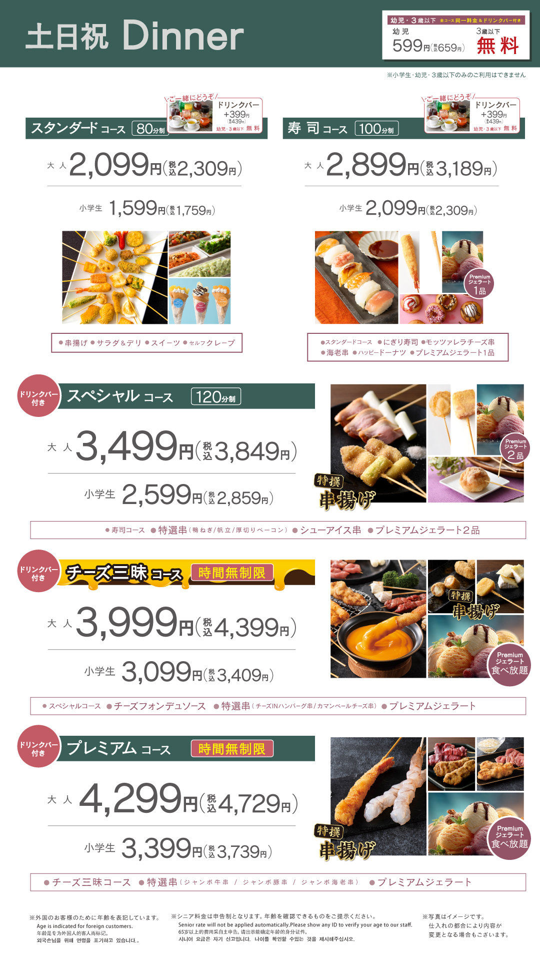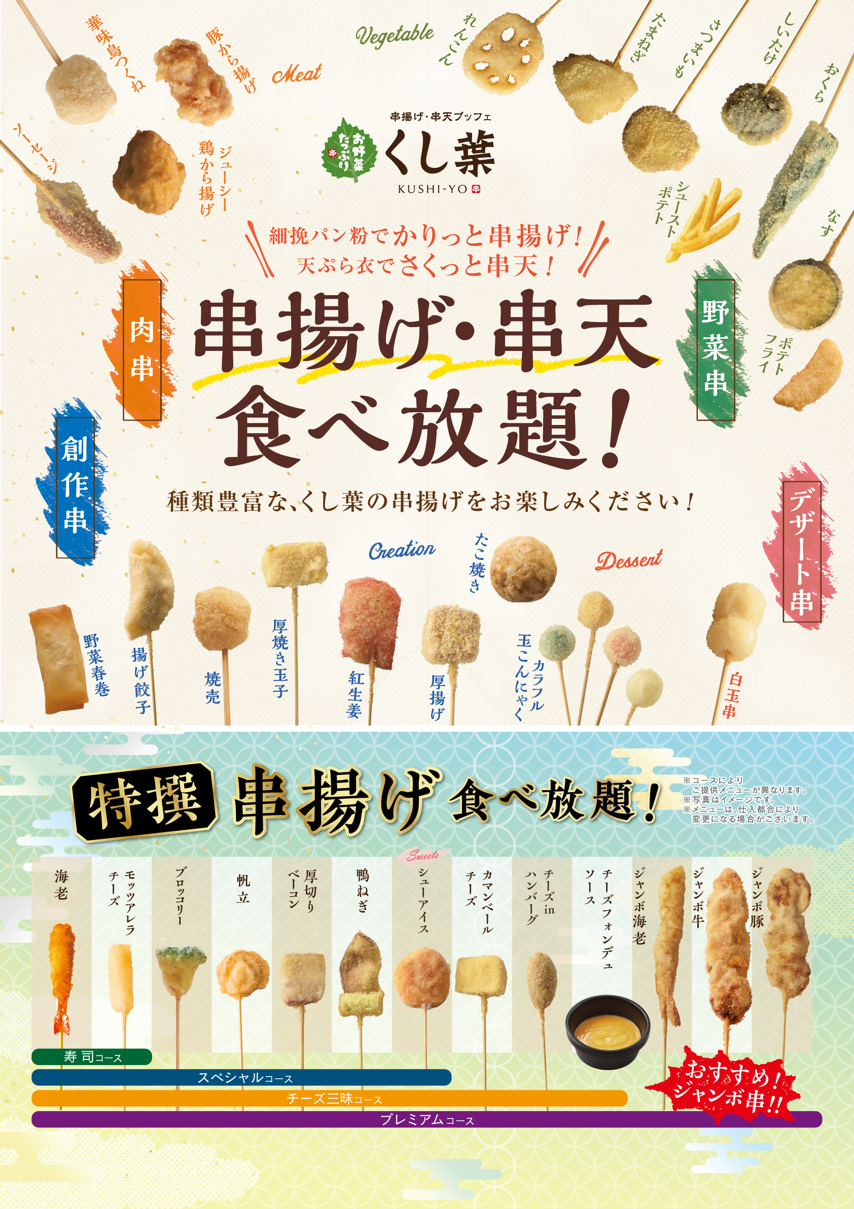 上記10種 + ジャンボ豚串 / ジャンボ牛串 / ジャンボ海老串