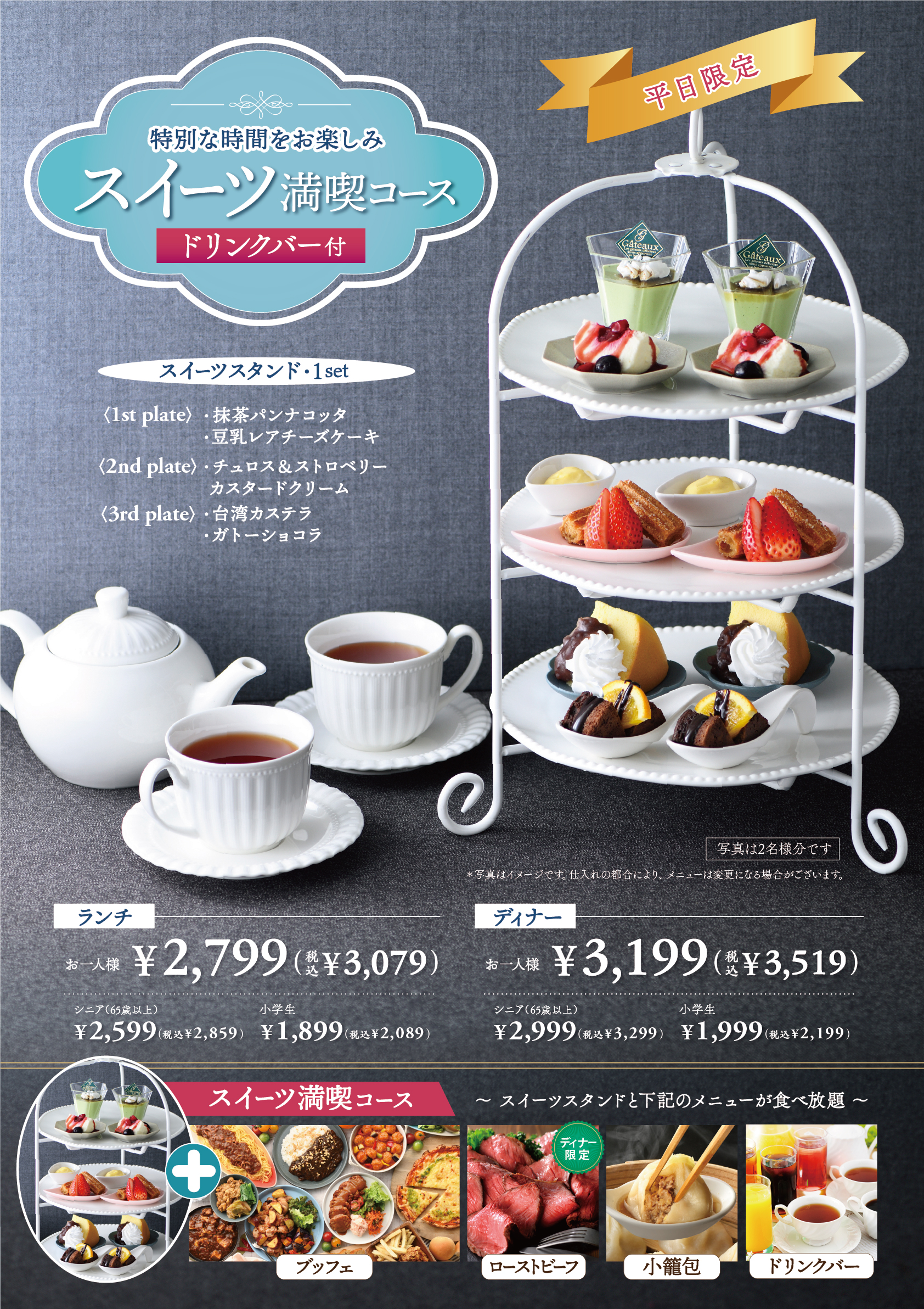 【ゆったり時間無制限♪平日はブッフェでヌン活♪】11/20~バラエティー豊かな食べ放題『ニラックスブッフェ』3店舗にて6種のスイーツが堪能できるスイーツスタンドが平日限定にて新登場!ドリンクバーもついてお得!