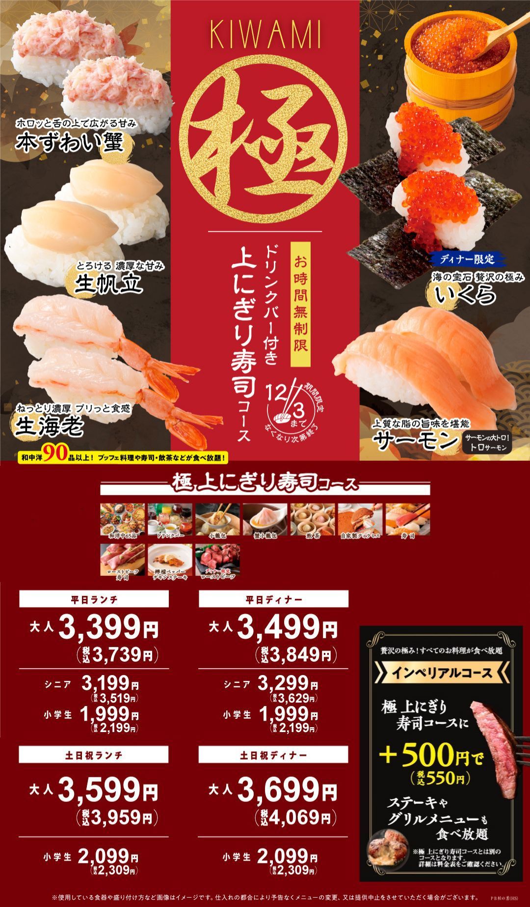【肉!!寿司!!時間無制限で贅沢三昧♪11/13〜12/3迄!充実の食べ放題「ニラックスブッフェ」にて『生帆立』などの上にぎり寿司に加え『ビーフステーキ』などのグリルも堪能できる特別コースが期間限定にて新登場!