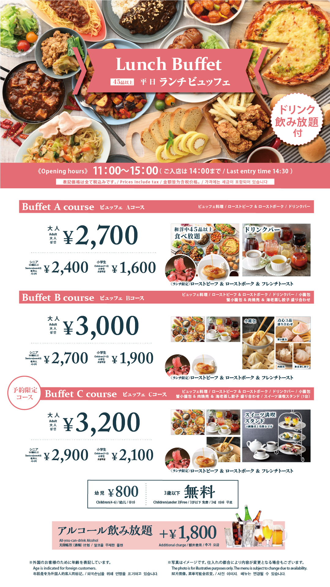 デザート&料理が食べ放題しかもソフトドリンク飲み放題で満足価格。平日は時間制限なくゆっくりとお食事時間を満喫できる嬉しいレストラン。