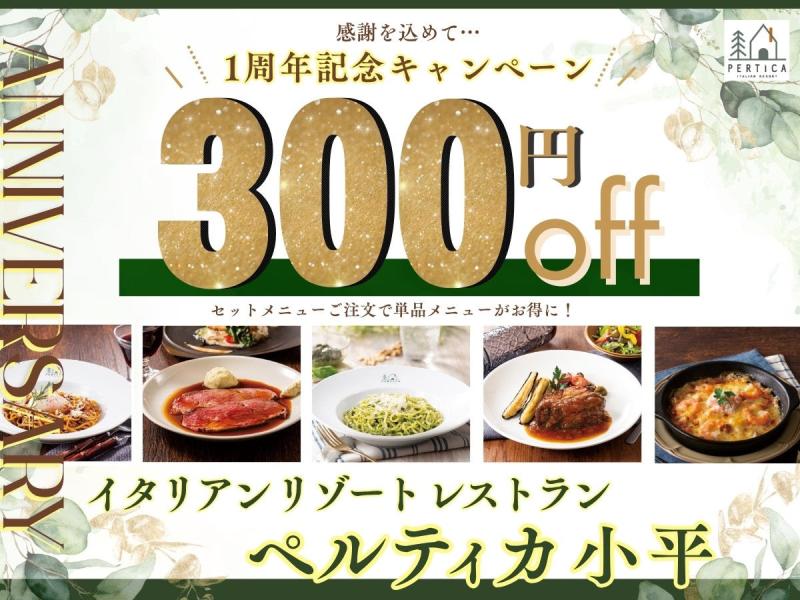 【イタリアン リゾート ペルティカ 小平】おかげさまで1周年!11/26迄の期間セットメニューご注文の方限定!追加オーダーはお得に300円OFF!『1周年記念300円OFFキャンペーン』を開催!